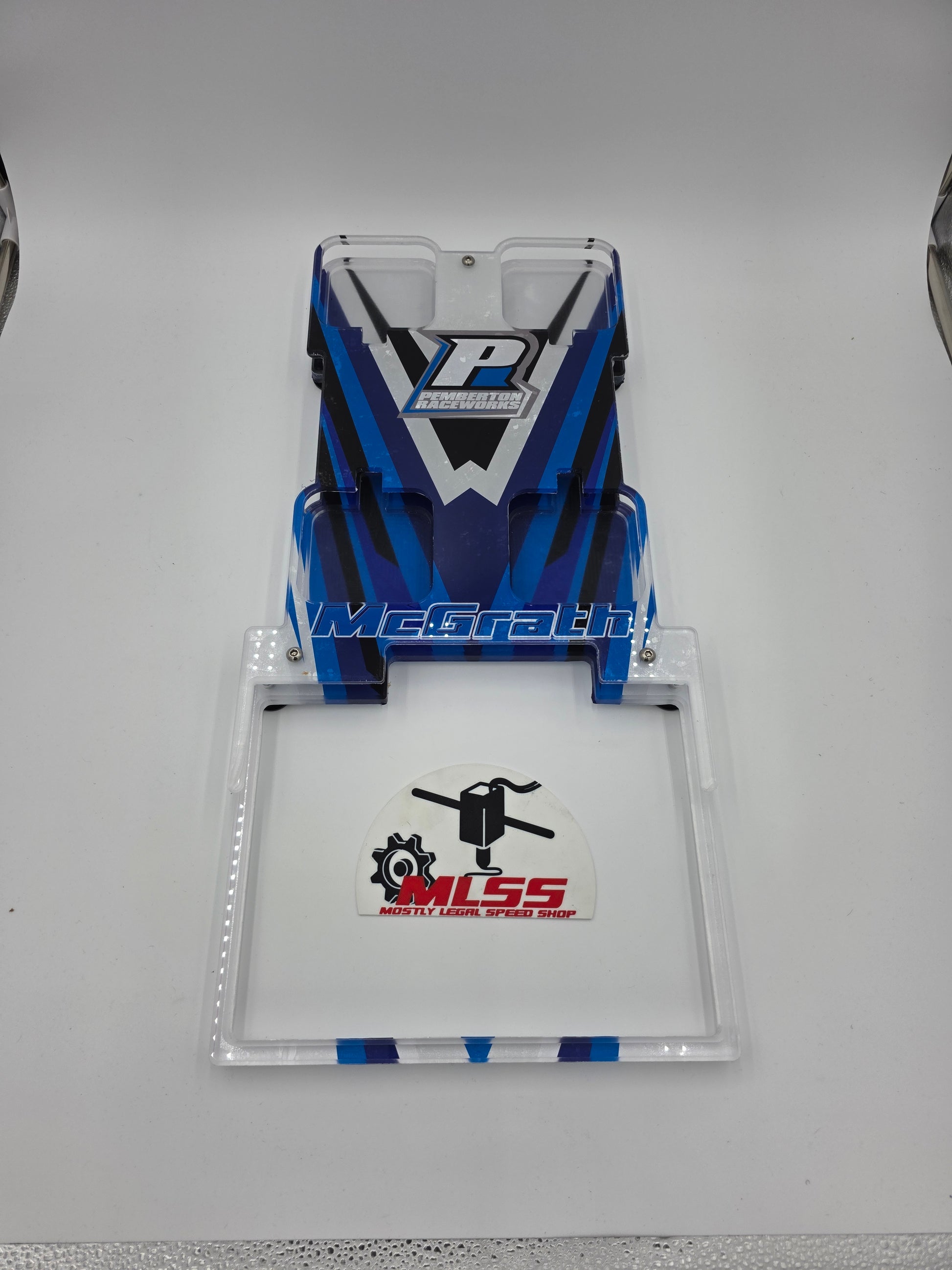 1/2" Acrylic with 4 Feet and a bubble Level. 2 piece design. Top piece hides everything. Custom made. Custom wrap.